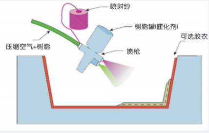 喷射成型工艺时利用喷射设备将树脂雾化,并与即时切断的纤维在空间混合后,落在模具面上,然后压实排除气泡,固化成型的一种工艺方法。喷射成型时在手糊的基础上发展起来的,其将手糊操作中的纤维铺覆和浸胶工作由设备来完成,是一种相对效率较高的成型工艺。